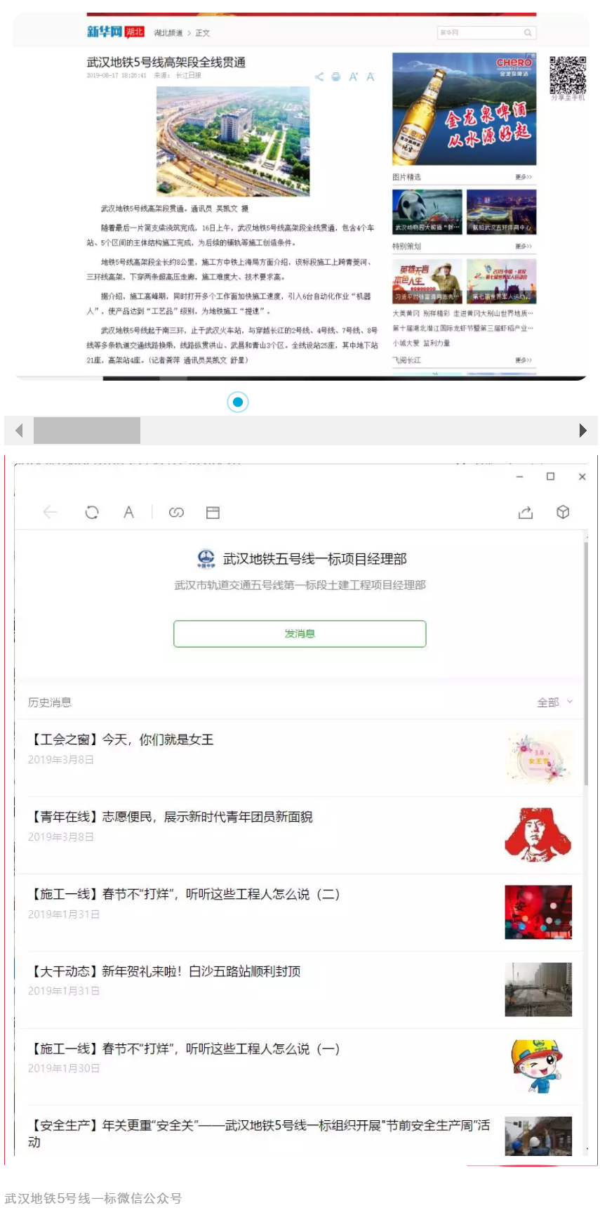武漢地鐵5號線一標(biāo)項目黨支部成立了由項目書記為組長的宣傳工作領(lǐng)導(dǎo)小組,組織制定了項目宣傳工作年度計劃及獎懲辦法。在《中鐵上海工程》報投稿工作方面,每月制定宣傳工作總結(jié)和下月工作計劃,截至目前已在《中鐵上海工程》報上刊稿6篇。在對外宣傳工作方面,在重大節(jié)點(diǎn)、人才培養(yǎng)、企業(yè)文化等方面深入挖掘,此外,黨支部還創(chuàng)辦了“武漢地鐵五號線一標(biāo)項目經(jīng)理部”微信公眾訂閱號,每日上傳施工日報,并結(jié)合施工生產(chǎn)、黨建工作及企業(yè)文化等方面情況,開辟了大干動態(tài)、黨群園地、信息速遞等欄目,第一時間推送微信信息,將微信公眾號打造成了展示項目文化的“窗口”。