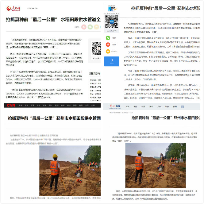6月10日,由公司承建的邳州市供水一體化PPP項目水稻田段供水管道全線貫通。邳州市供水一體化PPP項目水稻田段供水管道全長約30公里,自5月23日開始鋪設(shè)以來,項目部克服清障難度大、水文地質(zhì)多變、管材供應(yīng)量大且時間緊張等施工重難點,充分利用農(nóng)民收蒜的空檔期,加速施工進(jìn)度,19天完成30公里主管網(wǎng)鋪設(shè)任務(wù),較計劃工期提前5天。人民網(wǎng)、新華網(wǎng)、央廣網(wǎng)、中國新聞網(wǎng)、光明網(wǎng)、中國網(wǎng)、江南時報、江蘇視窗、徐州之窗等10余家中央級及省部級主流媒體對此進(jìn)行了專題報道: