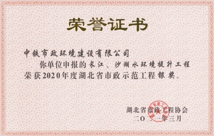 近日,2020年湖北省市政示范工程評(píng)選結(jié)果公布,公司長(zhǎng)江、沙湖水環(huán)境提升工程項(xiàng)目喜獲湖北省市政示范工程銀獎(jiǎng)。